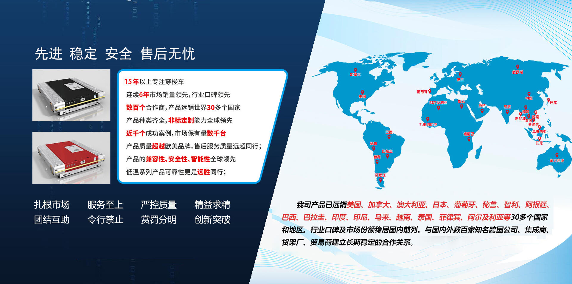 我司產(chǎn)品已遠(yuǎn)銷(xiāo)美國(guó)、加拿大、澳大利亞、日本、葡萄牙、秘魯、智利、阿根廷、巴西、巴拉圭、印度、印尼、馬來(lái)、越南、泰國(guó)、菲律賓、阿爾及利亞等30多個(gè)國(guó)家和地區(qū)。行業(yè)口碑及市場(chǎng)份額穩(wěn)居國(guó)內(nèi)前列。與國(guó)內(nèi)外數(shù)百家知名跨國(guó)公司、集成商、貨架廠(chǎng)、貿(mào)易商建立長(zhǎng)期穩(wěn)定的合作關(guān)系。累計(jì)數(shù)千臺(tái)穿梭車(chē)數(shù)百個(gè)成功案例,如:中石油、中石化、中糧、伊利、蒙牛、一頭牛、可口可樂(lè)、松下、東芝大王、牧田、益海嘉里、怡寶、東鵬、葵花、國(guó)藥、百靈、雙鶴、東方雨虹等。
